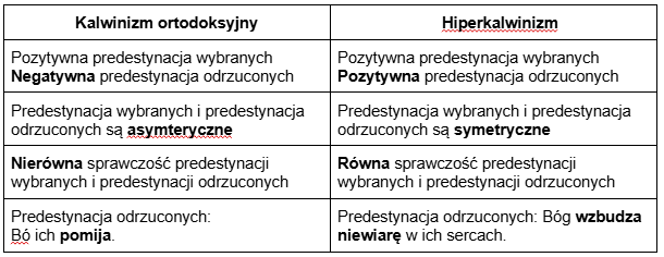 Tabela ukazuje różnice pomiędzy kalwinizmem ortodoksyjnym i tak zwanym hiperkalwizmem. Jej układ pozwala dostrzec pozytywno-negatywny schemat kalwinizmu, w myśl którego Bóg aktywnie działa w życiu i w sercu wybranych, jednocześnie pomijając potępionych (pozostawiając ich w ich naturalnym stanie.) Należy pamiętać, że zrządzając wybranie, Bóg bierze pod uwagę całą ludzkość w stanie upadłości. Decyduje się odkupić pewnych ludzi spośród upadłych, a reszę – pozostawić w stanie upadku. Wkracza w życie wybranych, powstrzymując się od tego w życiu odrzuconych. Jedna grupa otrzymuje miłosierdzie, druga – sprawiedliwość.